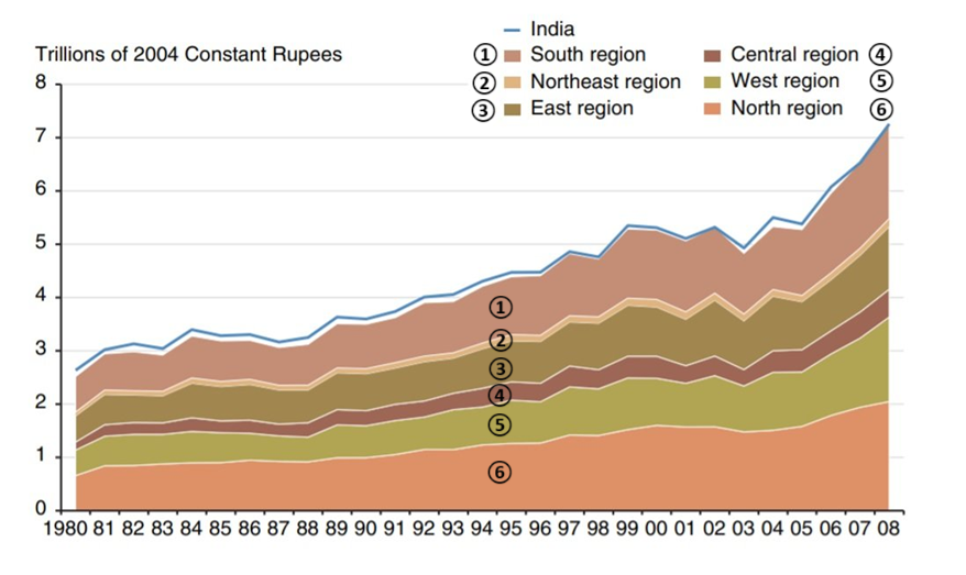 | From 1980 to 2008, the Central region (marked by 4 in the graph in Tab 2) experienced the smallest absolute increase in agricultural production among all six regions. |