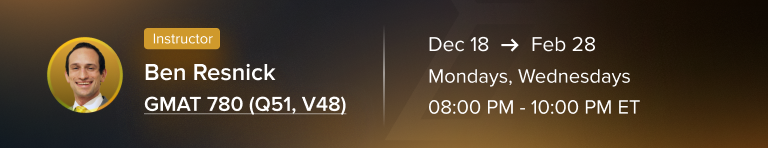 40 hours of live instruction from 780-scoring GMAT instructor Ben Resnick, you can accelerate your test prep timeline and take your GMAT Focus score to new heights.