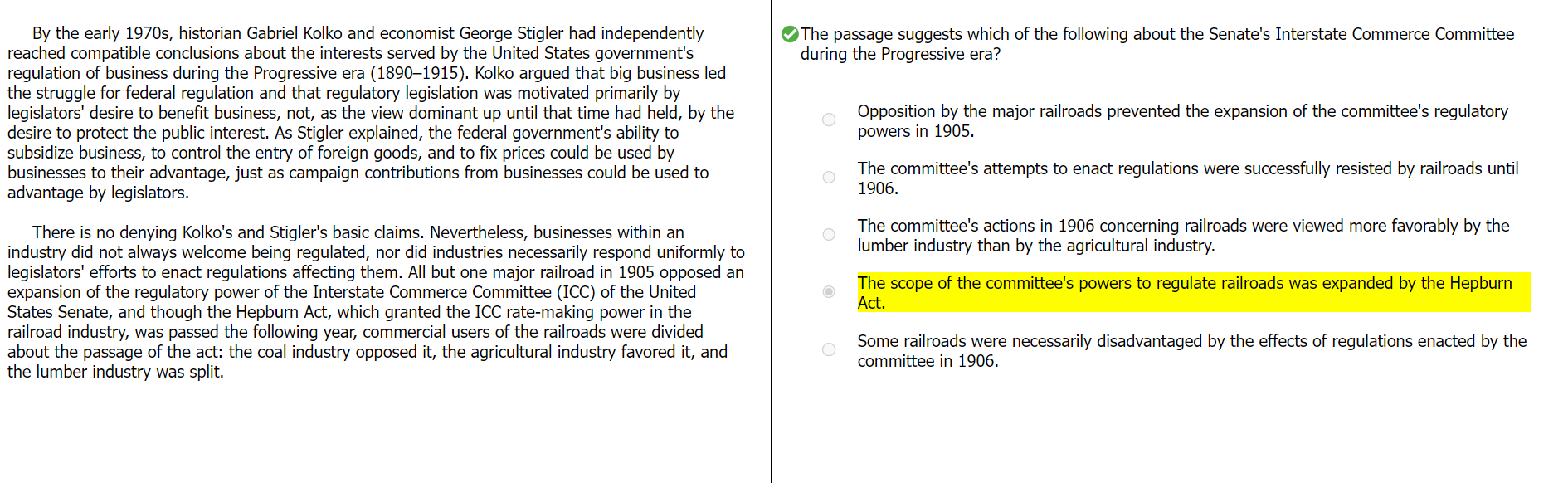Answer (C)Question 2.The passage suggests which of the following about the Senate's Interstate Commerce Committee during the Progressive era?