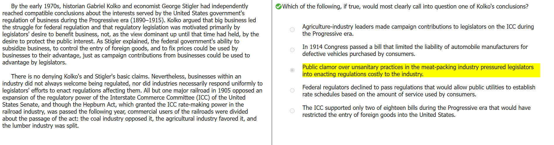 Question 1.According to the passage, scholars whose research on the Progressive era preceded that of Kolkoand Stigler subscribed to which of the following views about the federal regulation of businessduring the era?