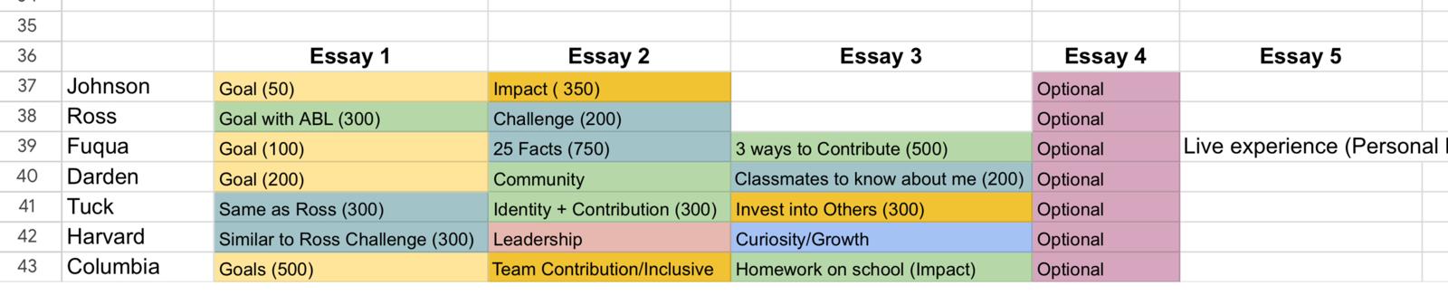 Guys, wanted to share how I approach wring essay to multiple schools. I grouped them into colors based on the topic and stories that I’ll use. Maybe someone will find it helpful