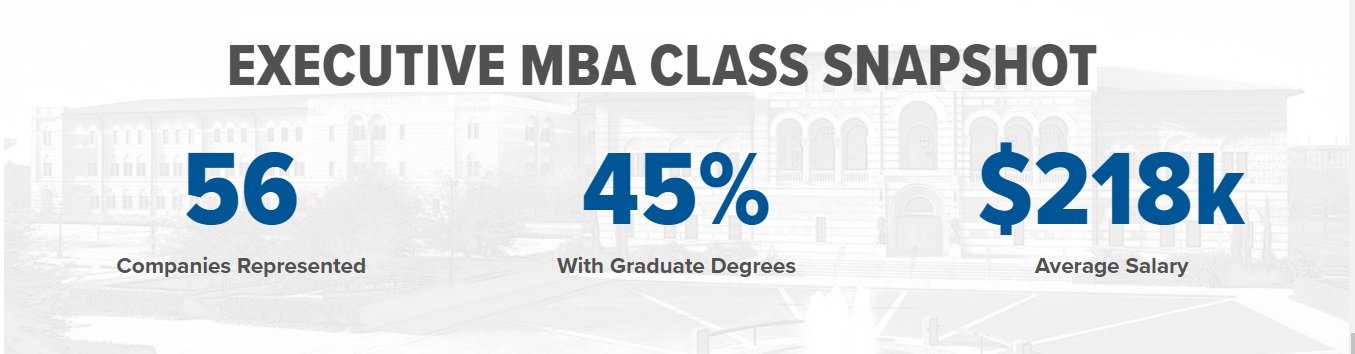 The Executive MBA (EMBA) is for the most experienced students, who have at least 10 years of work experience. The EMBA program is part-time, with classes all day on Fridays and Saturdays, every other weekend.