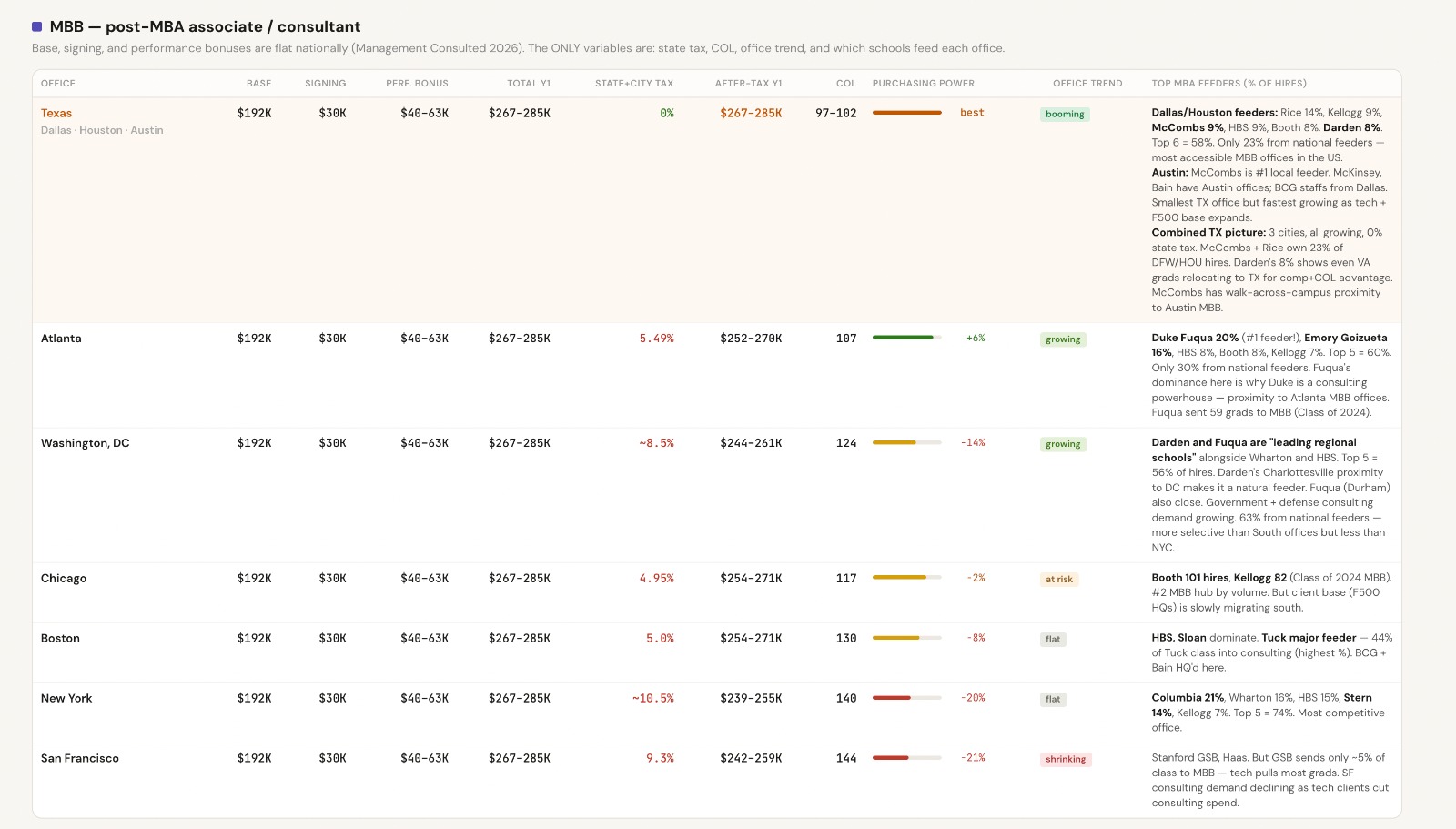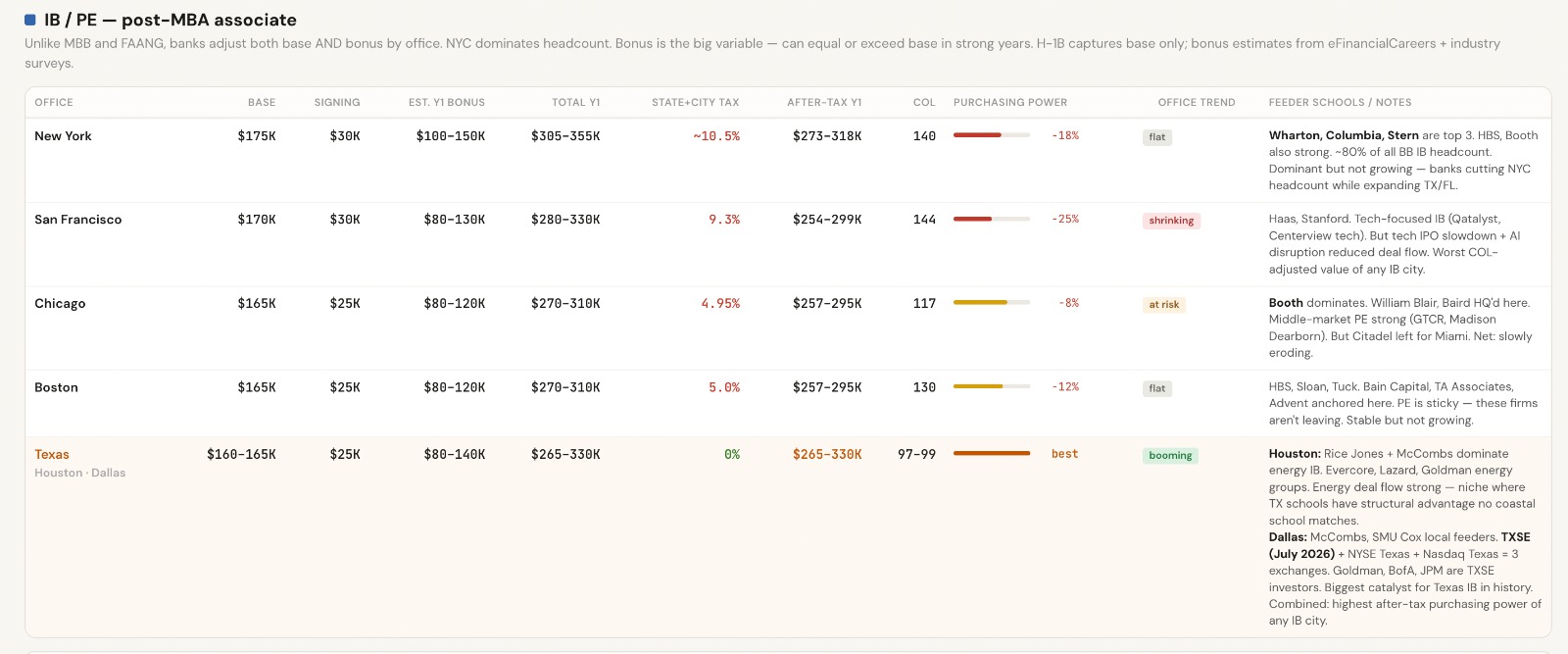 IB/PE -IB is the one sector where NYC's pay premium is real . TXSE is the single biggest structural catalyst for Texas finance jobs in decades. Watch Dallas IB headcount and comp climb. Texas Stock Exchange opening in 2026