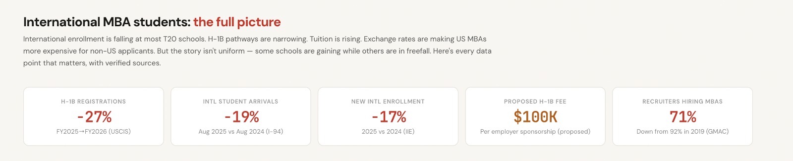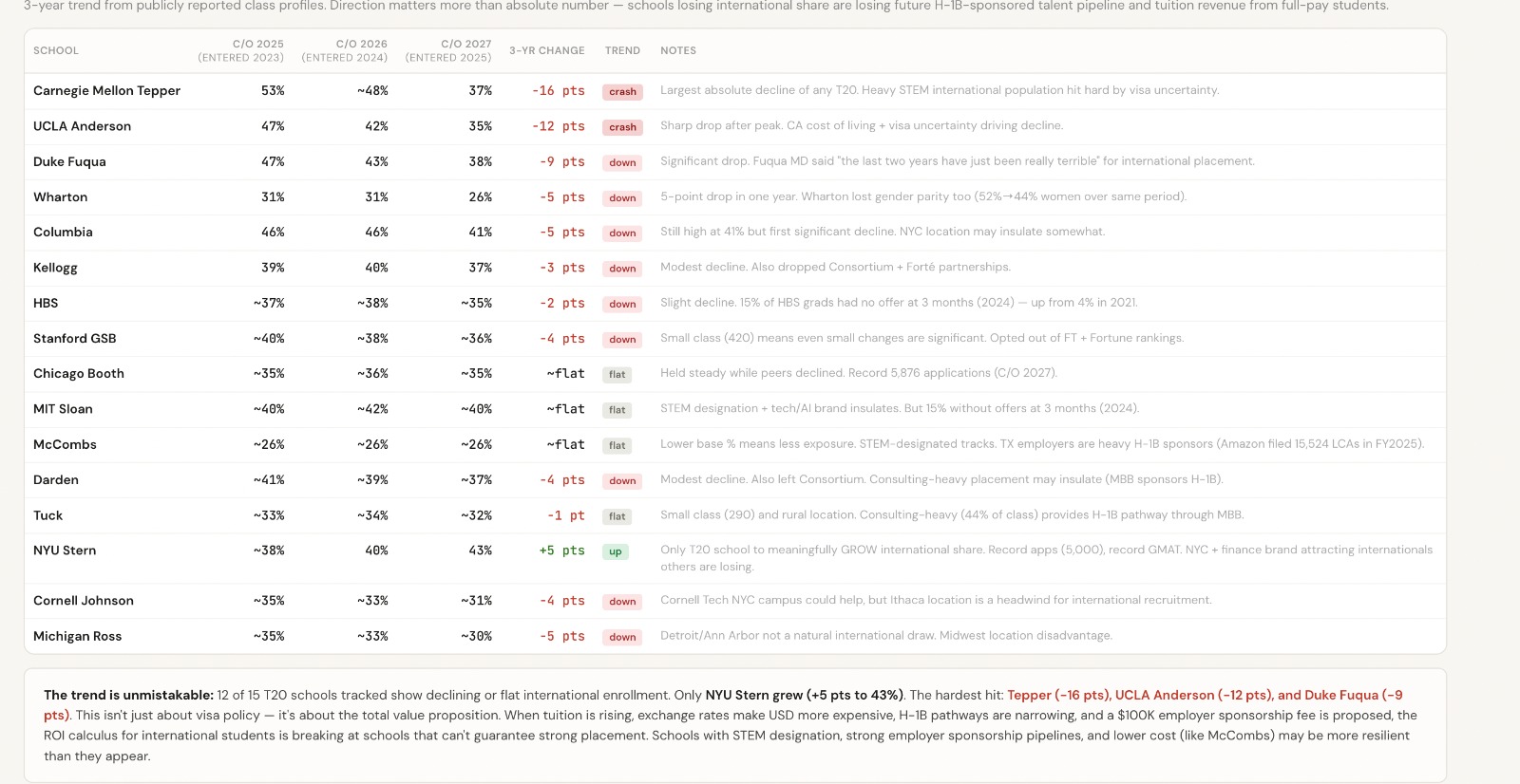 International student enrollment — T20 schools (Class of 2025 → 2027)