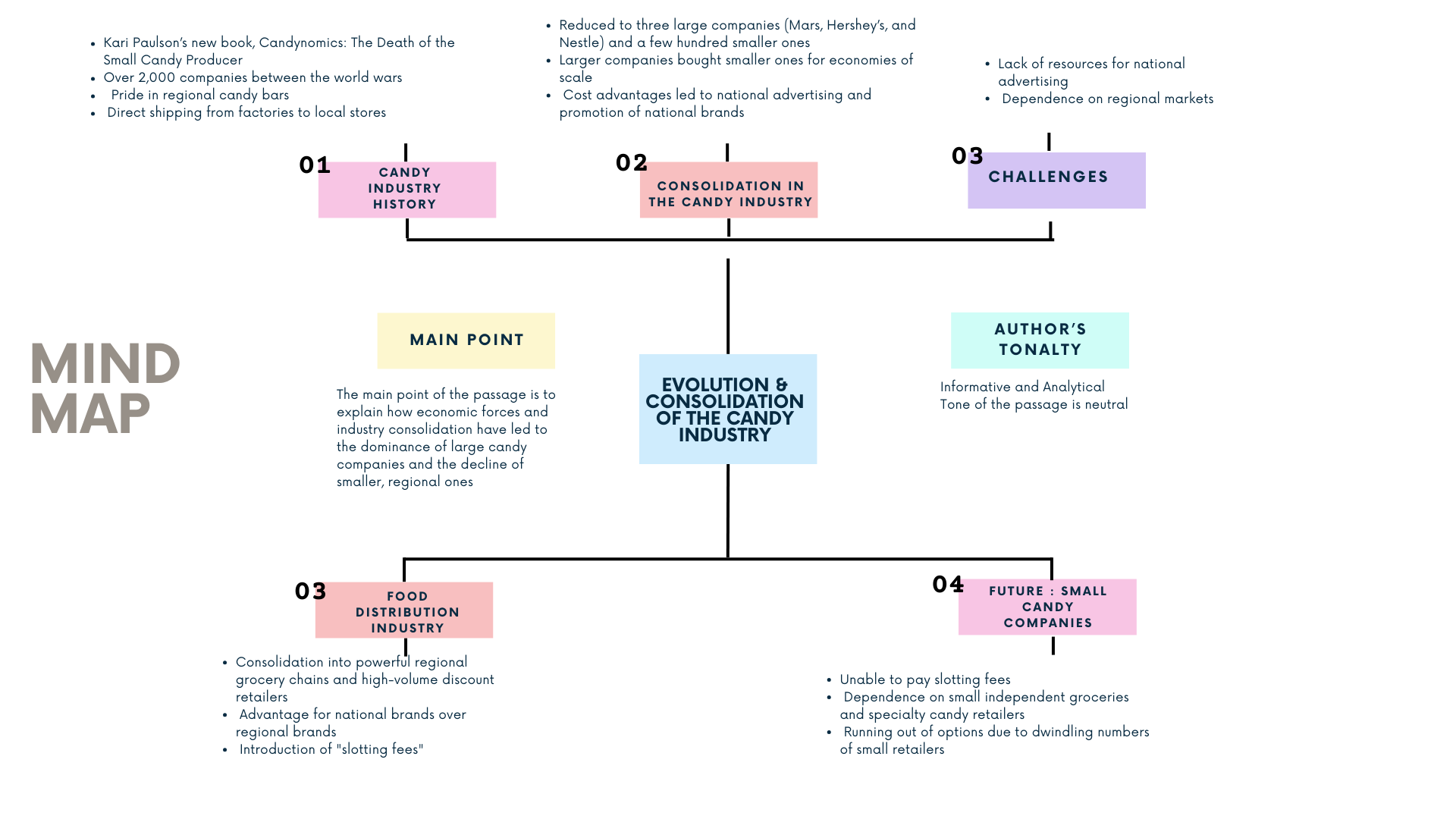 Subsequent paragraph explains how this consolidation takes place in candy production and how the small candy distribution market is affected by the consolidation of food distribution industry.