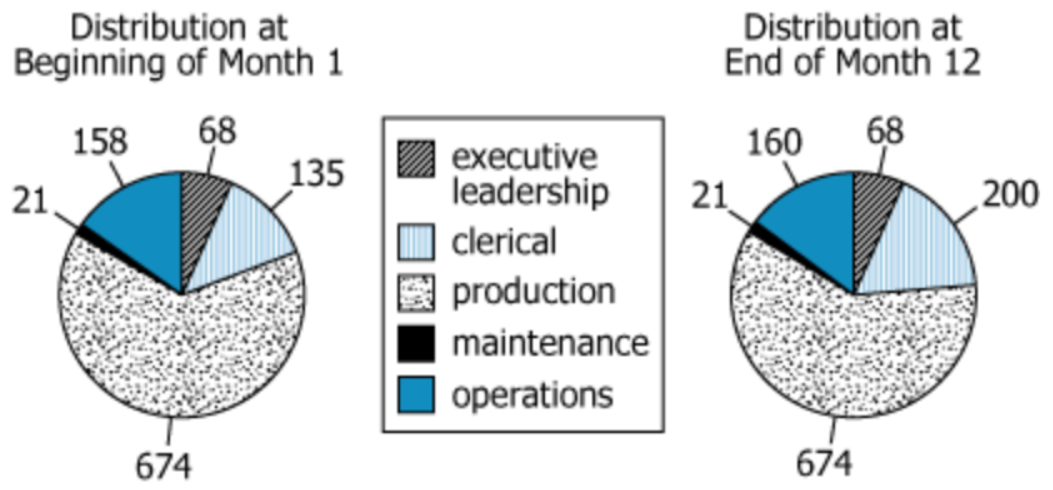 Comparign the 2 pie charts, we see that in operations, we have 2 more employees and in clerical, we have 65 more employees at the end of year. So 67 people are extra at the end of the year compared to the beginning. In all other categories, the number of employees is the same. This does not mean that no one left from those categories. Say it is possible that 50 production guys left and 50 new production guys joined in the year. That is why the number of production guys remained the same at the end of the year.