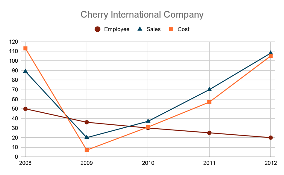 The graph has three lines depicting number of employees and sales & cost. Further Profit = Sales - CostFirst Blank: We have to give the year tha had maximum profit per employee.=> \(\frac{Profit}{employee}=\frac{Sales-Cost}{employee}\)