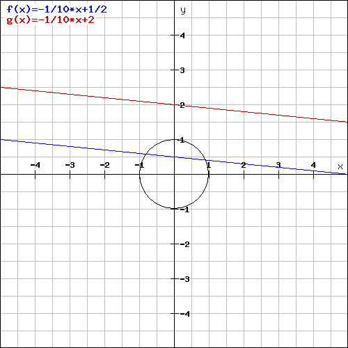 infinitely many parallel lines with X-intercept more than 1 and slope -1/10, some will intersect the circle (for example line with X-intercept 1.1) and some not (for example line with X-intercept 1,000,000). Check the image below for two possible scenarios: blue line (with the slope of -1/10 and the x-Intercept greater than 1) intersects the circle while the red line (also with the slope of -1/10 and the x-Intercept greater than 1) does not.