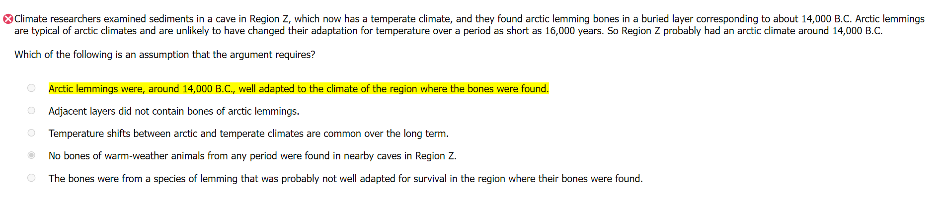 After all, if lemmings were NOT well adapted to that climate, then the fact that lemming bones were found in Region Z would not be a reason to believe that Region Z had an arctic climate. After all, in that case, lemmings could have been adapted to an arctic climate while Region Z had a different kind of climate to which the lemmings were not well adapted.