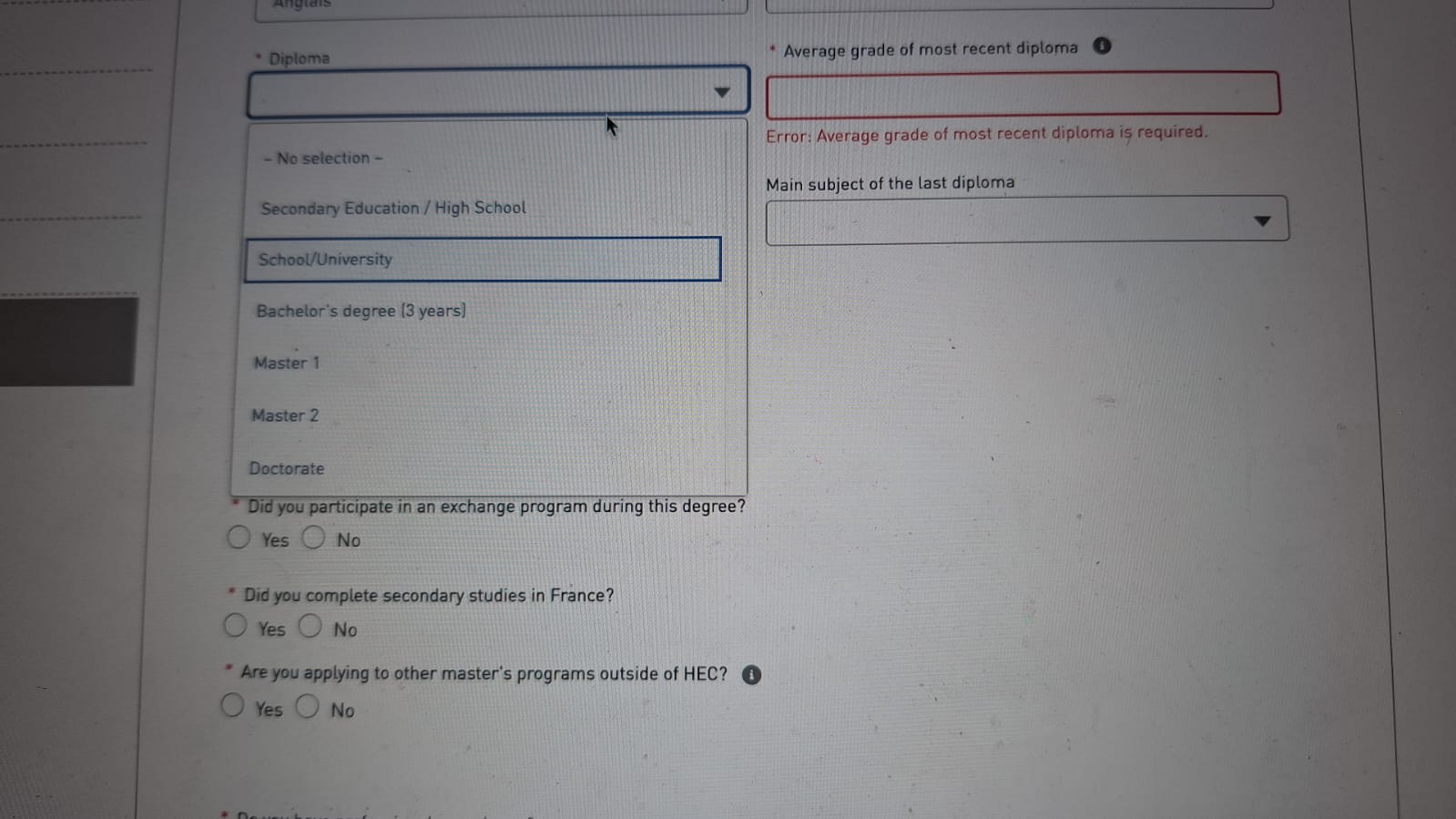 What should i select in diploma field and also in ladder