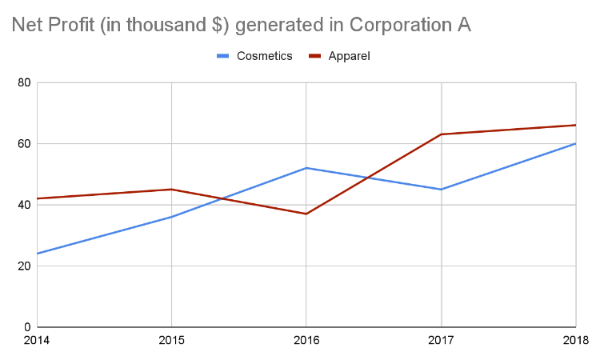 Corporation A has exactly two different divisions, one dealing in cosmetics and the other apparel. The line graph above shows the profit generated by the two divisions over a period of five years.