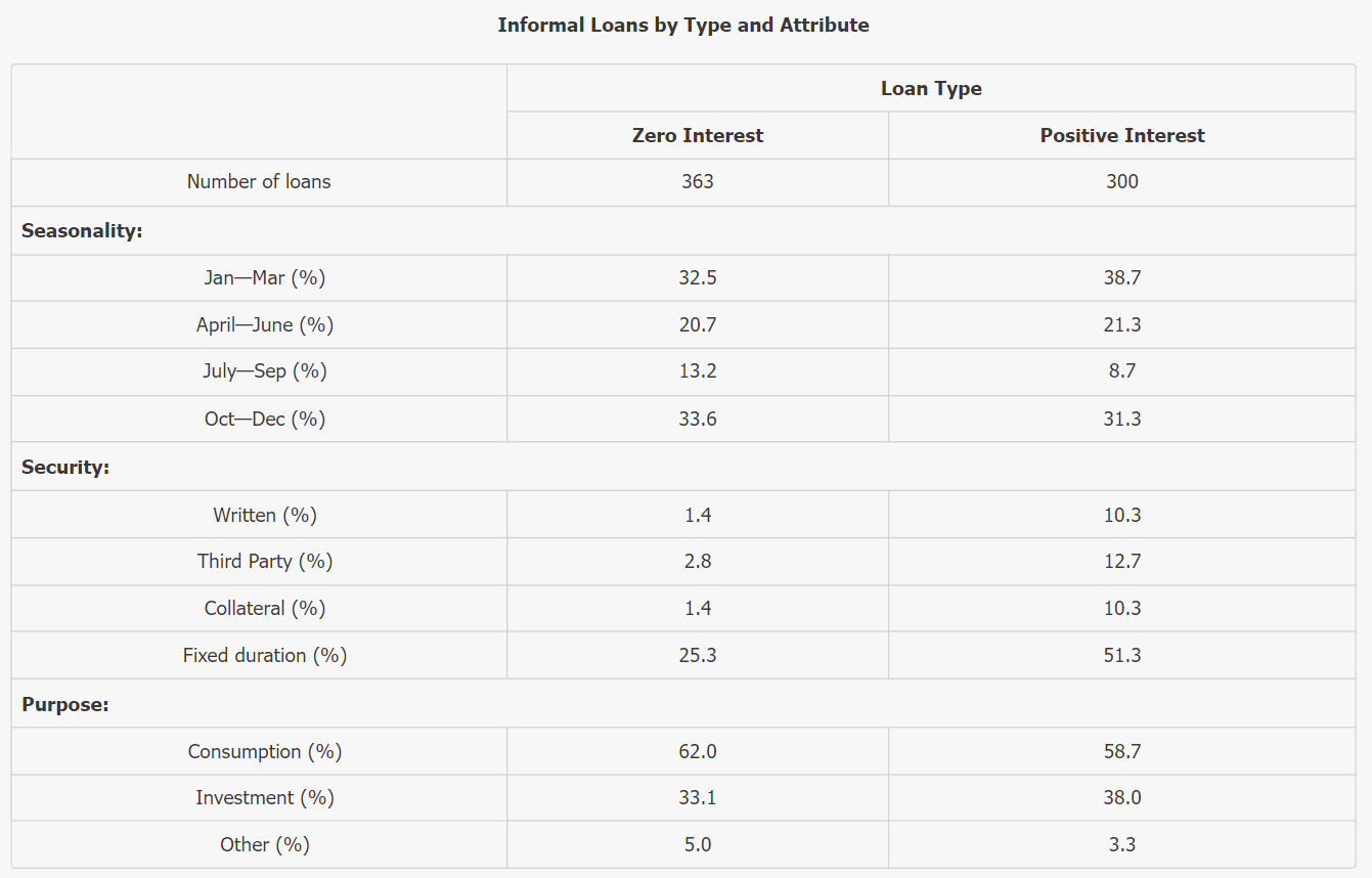 In 1930s rural China, informal credit was sometimes court enforced. However, it was more often self-enforcing, especially in remote areas. With a positive–interest rate loan, the borrower would pay principal and interest. With a zero–interest rate loan, the borrower would repay the principal and provide some non-monetary resource in lieu of interest. For example, the borrower might have supplied land, labor, or draft animal services to the lender.