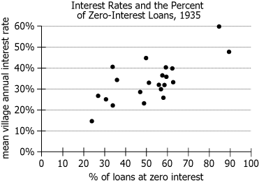 The village’s mean annual interest rate in 1935 was greater than 45%.... We can check that there are only two dots above 45% in Y-axis, and both these dots correspond to more than 80% on X-axis, so YES