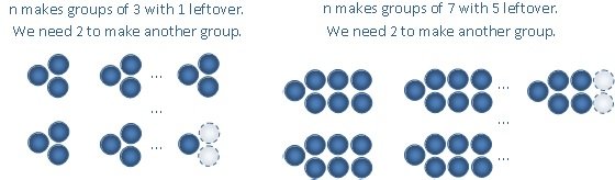 Solution: So n is a number 2 greater than a multiple of 3 (or we can say, it is 1 less than the next multiple of 3). It is also 5 greater than a multiple of 7 (or we can say it is 2 less than the next multiple of 7)