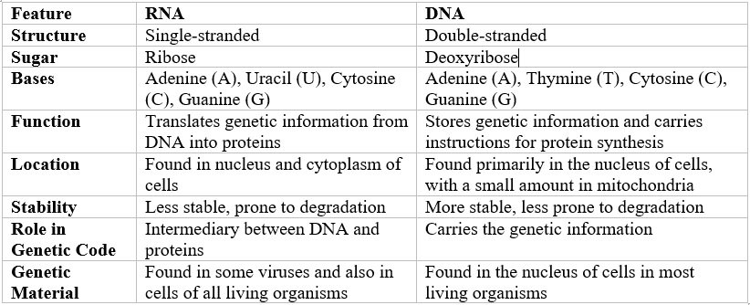 | RNA Translates genetic information from DNA into proteins while DNA Stores genetic information and carries instructions for protein synthesis. | |