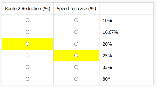 Route 2 Reduction (%) the percentage by which Route 2 should be shorter than Route 1 to complete it in 4 hours at the first-day speed, and for