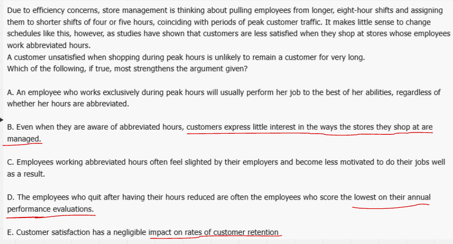 Due to efficiency concerns, store management is thinking about pulling employees from longer, eight-hour shifts and assigning them to shorter shifts of four or five hours, coinciding with periods of peak customer traffic. It makes little sense to change schedules like this, however, as studies have shown that customers are less satisfied when they shop at stores whose employees work abbreviated hours.