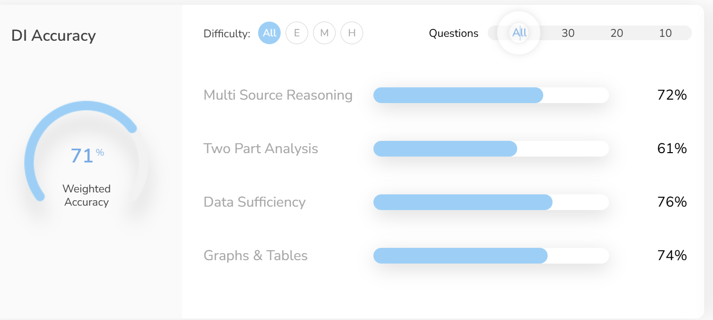 DI JourneyData Insights was interesting because I quickly realized it's not just about numbers - it's truly a combination of verbal and quant skills. If you're weak in either area, you'll struggle with DI. I experienced this firsthand in my exam where I encountered everything from Two-Part Analysis to CR-style passages in the DI section.