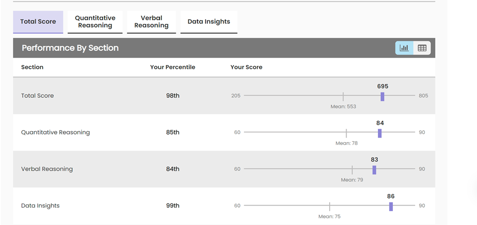 DI – From DI79 to DI86:My journey with Data Insights was particularly interesting. Starting with a DI79 in my last attempt, I was already performing decently, but I knew I needed to push further for a top score. The initial challenges were time management across the different question types, difficulty in handling multiple data sources efficiently, finding myself re-reading data multiple times, Struggling with verbal-heavy DI questions especially MSR due to my reading challenges.