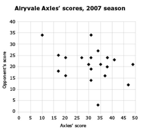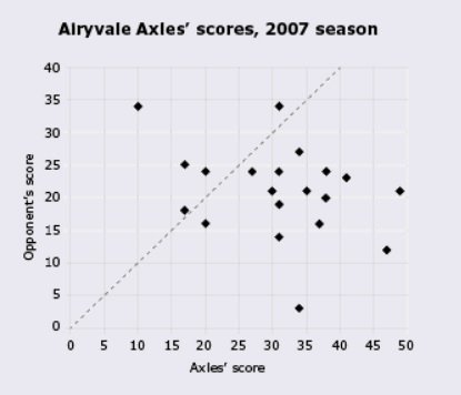 Official ExplanationThe scatter plot measures opponents' scores vertically and the Axles' scores horizontally. For example, the lowest dot vertically indicates a score of 34–3 in favor of the Axles. A 45-degree line from the origin would divide the Axles' wins (beneath the line) from losses (above the line). Also, note that the horizontal values go up to 50, while the vertical values stop at 40.