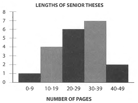Each senior in a college course wrote a thesis. The lengths in pages of those seniors's theses are summarized in the graph.