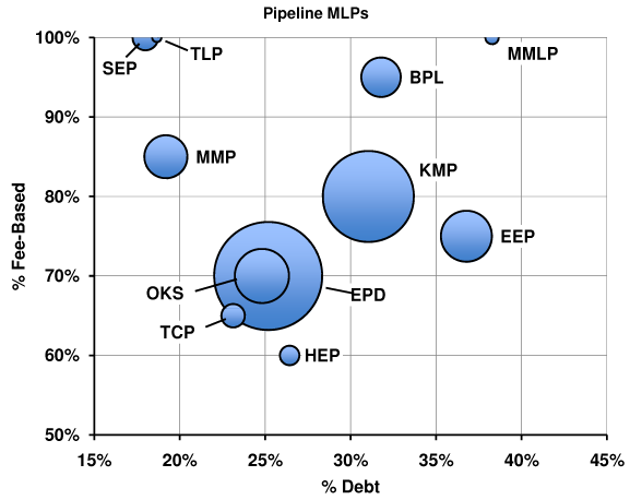 Eleven master limited partnerships (MLPs) that operate hydrocarbon pipelines in the US are shown in the graph, labeled by their three – letter or four – letter financial market abbreviation. The area of each bubble corresponds to the MLP's enterprise value (EV), the dollar sum of its market capitalization (equity) and its outstanding debt as of March 2, 2012. That debt, as a percent of EV, is shown on the horizontal axis; less debt as a percentage of EV is considered safer for investors. The vertical axis corresponds to the estimated percent of the MLP's revenue that is fee-based; a larger share of revenue that is fee-based is considered safer for investors.