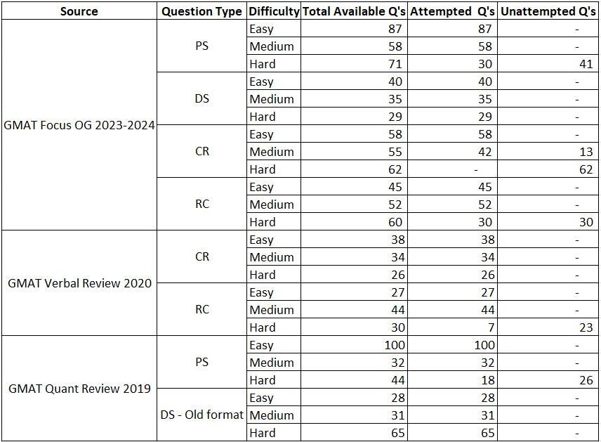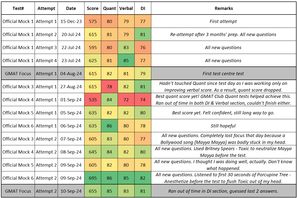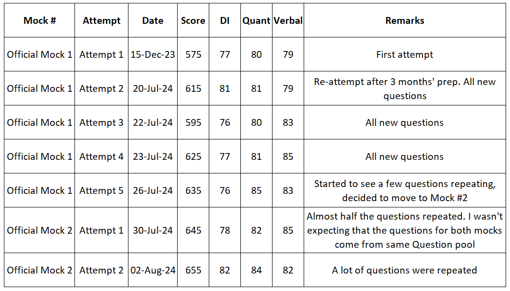 2) Solved two of the official Free mocks scored 615 in one and 645 other one. Badly struggled to finish DI on time. Also, rushed through last 3-4 questions in verbal.