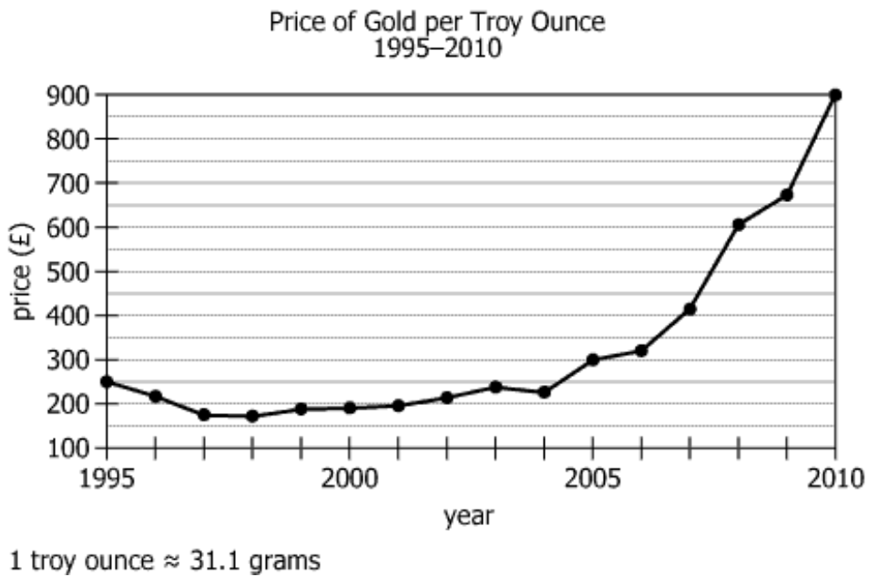 | Years | Price for 1 troy ounce of gold | Price for \(\frac{100}{31.1}\) troy ounces of gold | Estimated year-end price |