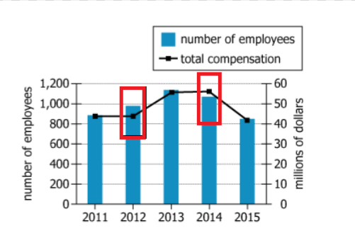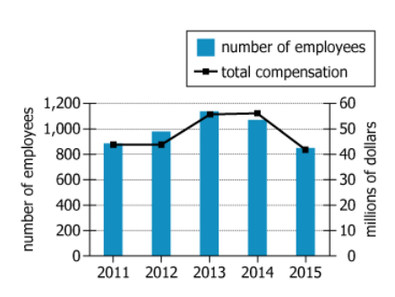 The total compensation is highest for 2013 and 2014 . They are at the same level. But the denominator i.e no. of employees is slightly smaller ( the height of the vertical bar) for 2014. Hence avg. compensation per employee is highest for 2014. Others can be ruled out easily. The compensation is on the lower side for 2011 , 2012 and 2015. But for 2012 , the bar indicating number of employees is tallest among the three. Hence , avg. compensation per employee is least for 2012 because the denominator is biggest for it ; hence the fraction is smallest.