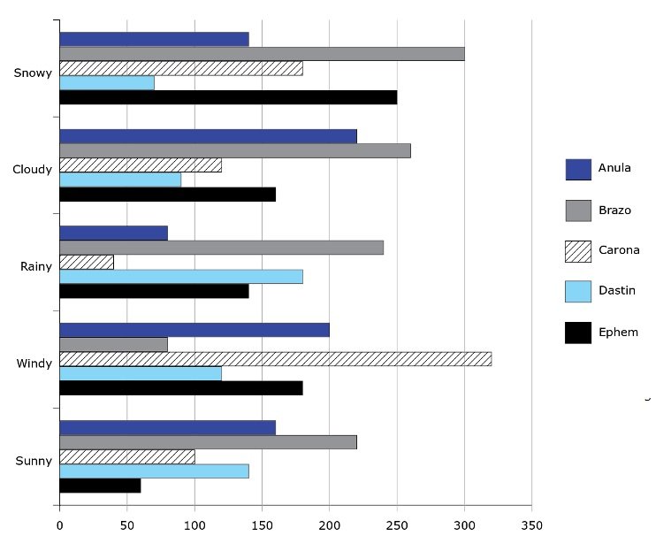 The x-axis indicates number of days, and the y-axis indicates types of weather. Each group of five bars gives us the number of days that each of the five planets experienced that type of weather.
