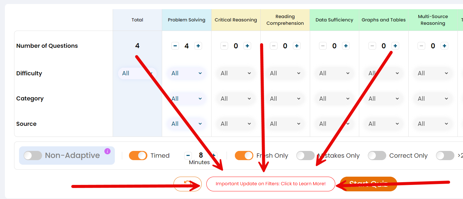 - 1. Select Number of questions - You can set how many questions you want from each section (PS, DS, MSR, G&T, TPA, CR, and RC). To make your life easier, we assume most of you allot 2 minutes for a question and 6 minutes for an RC passage. You can further refine however you please. You can also turn off the timed test with a single click.