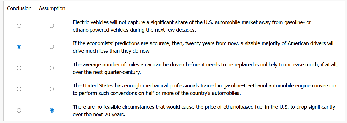 Mark the Conclusion column for the statement below that is most strongly supported as a conclusion of the statements above. For the argument consisting of the above statements together with your chosen conclusion, mark the Assumption column for the statement upon whose truth the validity of that argument depends. Pick only two choices, one in each column.