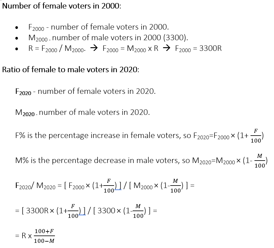Hence, for “Number of female voters in the year 2000” column, “3300 R”, and for “Ratio of female to male voters in the year 2020” column, “\(R*\frac{100 + F}{100 + M}\)” is the correct combination of the answer choices.