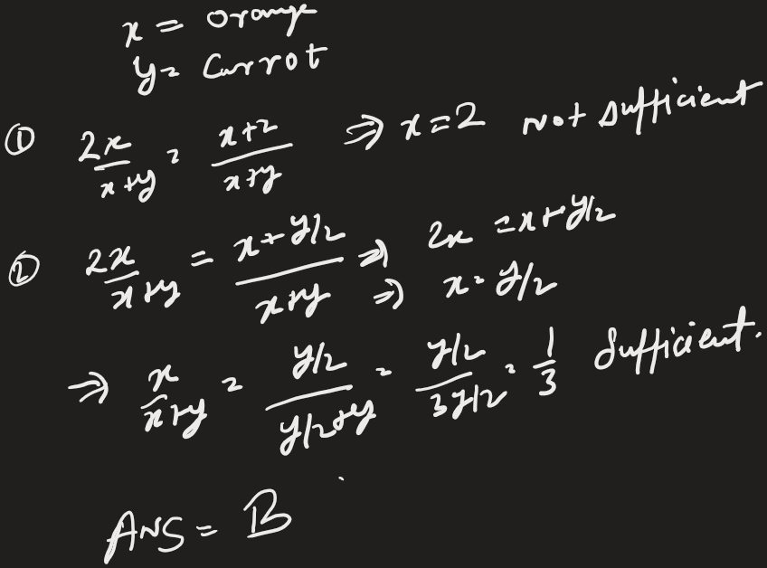 Therefore we know that there are 2 liters of orange juice that we can calculate with the information provided in statement (1). However, the question is asking for the percentage of orange juice in the mixture. We cannot find this out with the information provided because we have two unknowns: the volume of carrot juice and the percentage of orange juice.