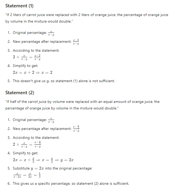 (2) If half of the carrot juice by volume were replaced with an equal amount of orange juice, the percentage of orange juice by volume in the mixture would double.