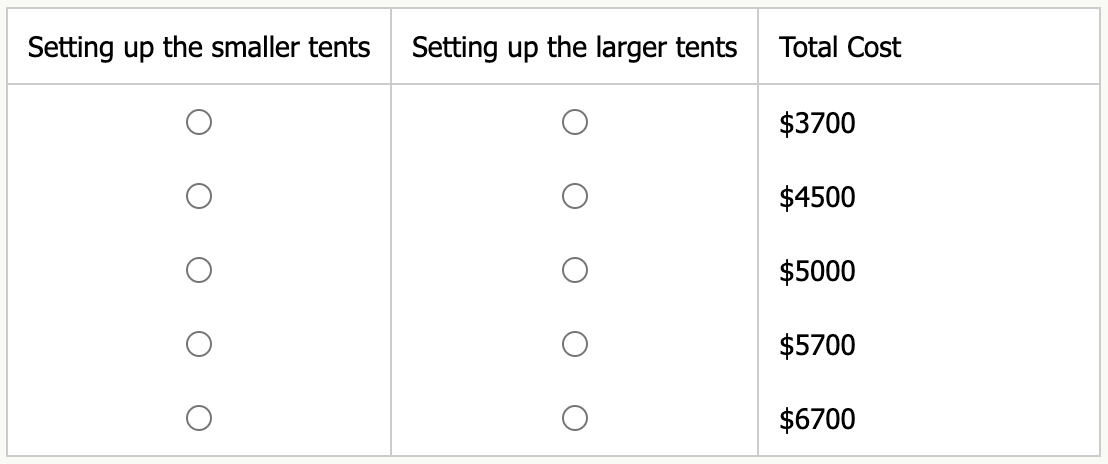 In the table, select the values that, approximately, indicate the total cost of setting up the smaller and larger tents for accommodating all 100 participants. Make only two selections, one in each column.