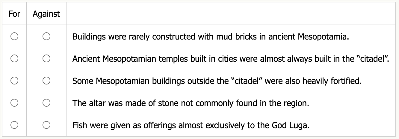 We are looking for the proposition that would provide the strongest evidence for and against the hypothesis that the building was a temple to the God Luga