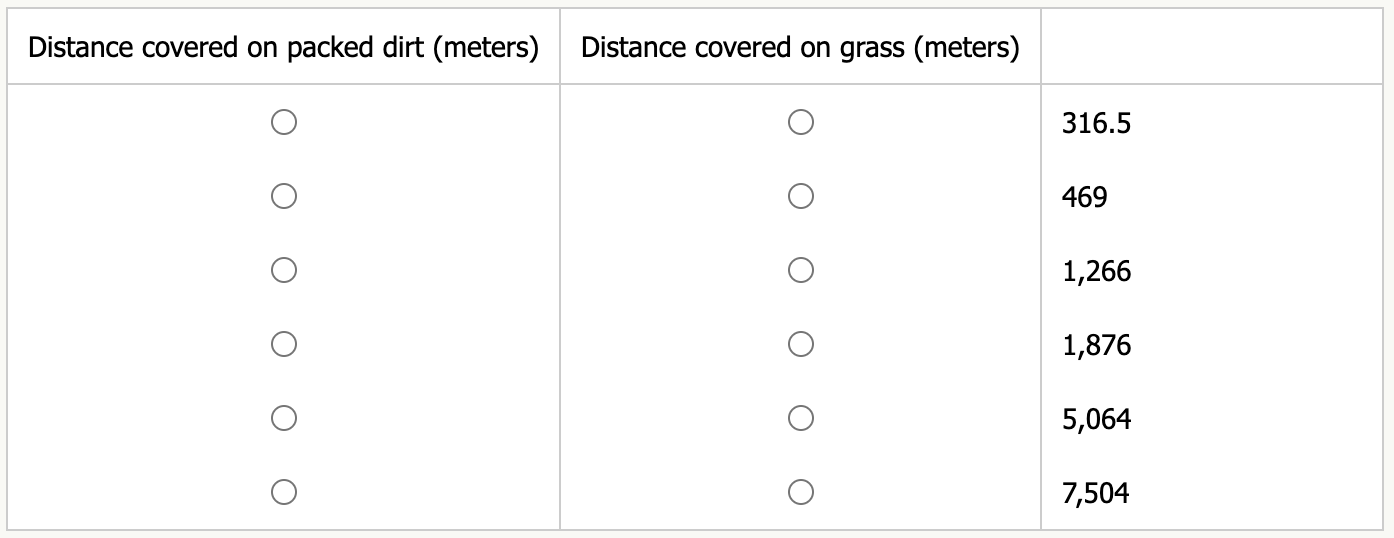Distance covered on packed dirt = 469 metersDistance covered on grass = 1876 meters