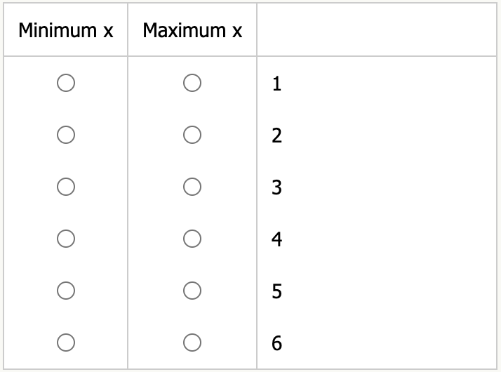 A student was given an equation, x * y = z, where x, y, and z are different digits and y > x. Select for Minimum x the least possible value of x, and select for Maximum x the maximum possible value of x. Make only two selections, one in each column.