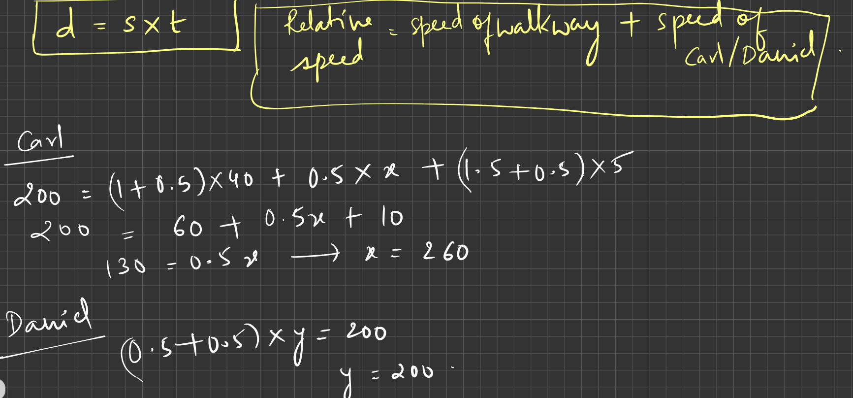- Daniel walks at a constant rate of 0.5 meter per second relative to the walkway, from start to finish without stopping, and reaches the end in y seconds.