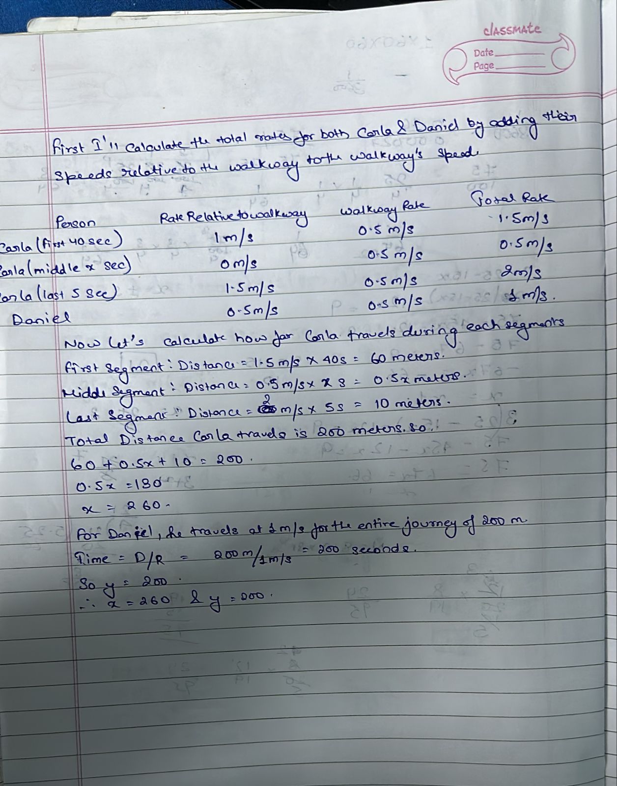 - Daniel walks at a constant rate of 0.5 meter per second relative to the walkway, from start to finish without stopping, and reaches the end in y seconds.