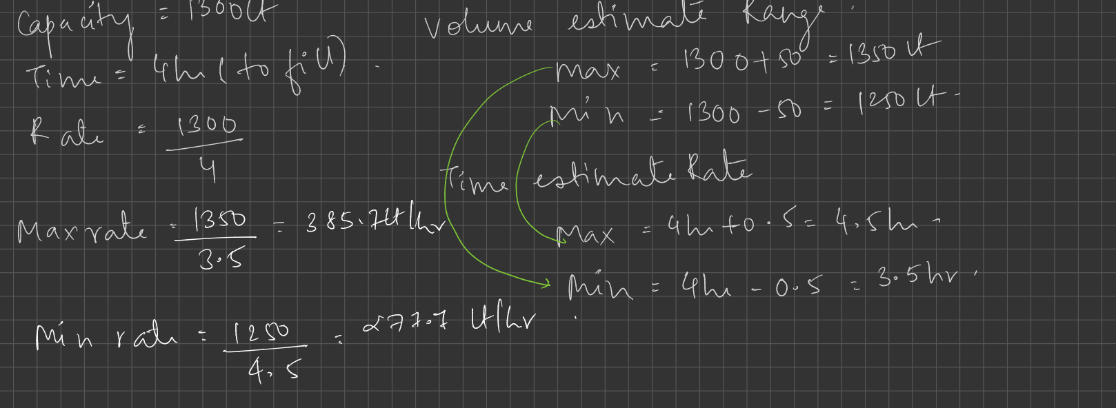 A maintenance team estimated that a certain pipe pumped 1,300 liters of water into a storage tank in 4 hours. The volume estimate may be off by up to and including 50 liters, and the time estimate may be off by up to and including 0.5 hours.