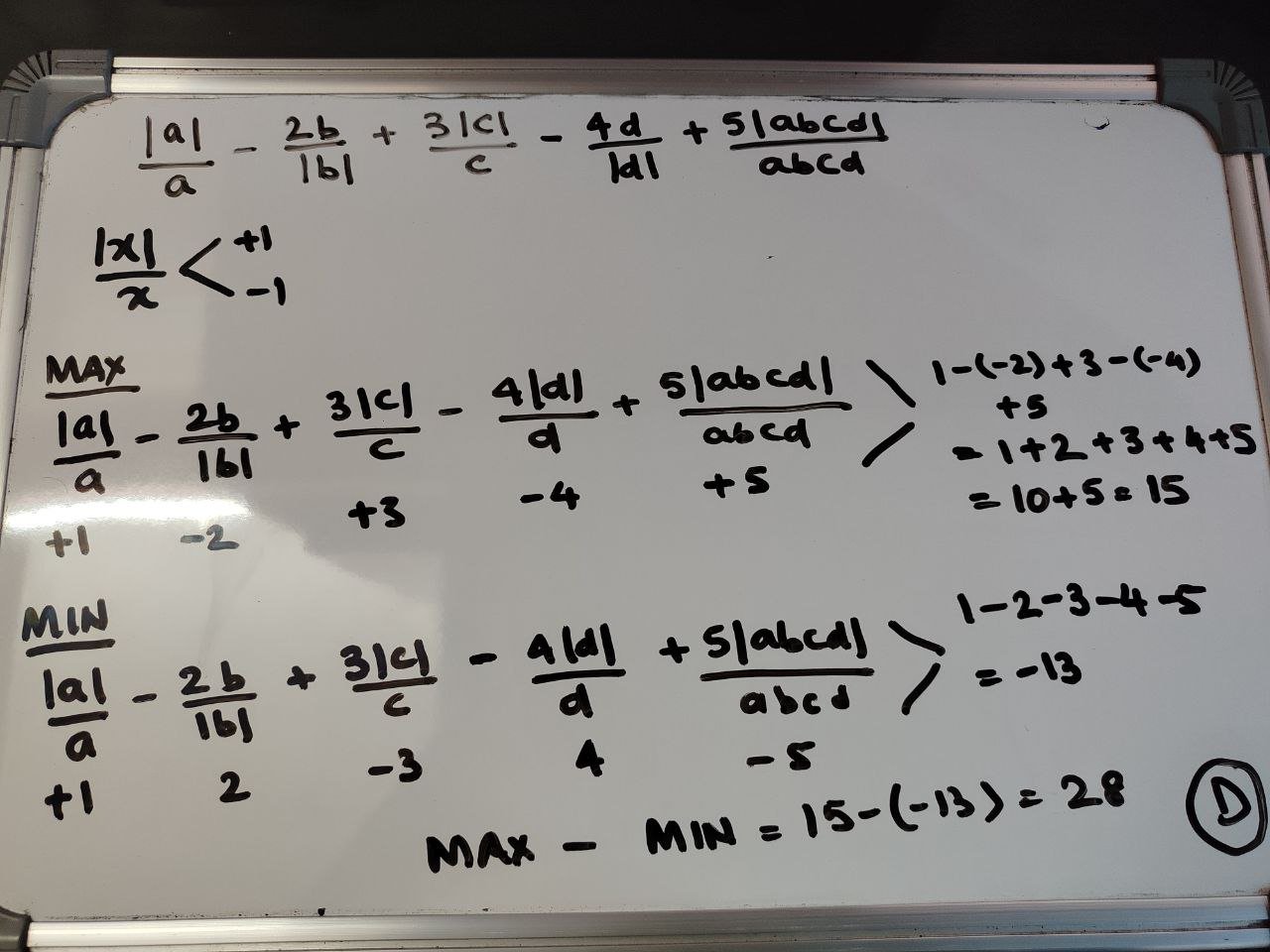 |a|/a - 2b/|b| + 3|c|/c - 4d/|d| + 5|abcd|/abcd=>a/a - 2b/b + (3*(-c)/c) - 4d/d + (5*(-abcd)/abcd)