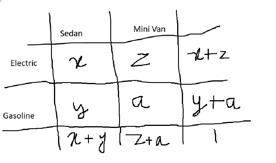 A rental firm has only two distinct types of vehicles: minivans and sedans. Each vehicle runs on exactly one fuel type, either gasoline or electricity.