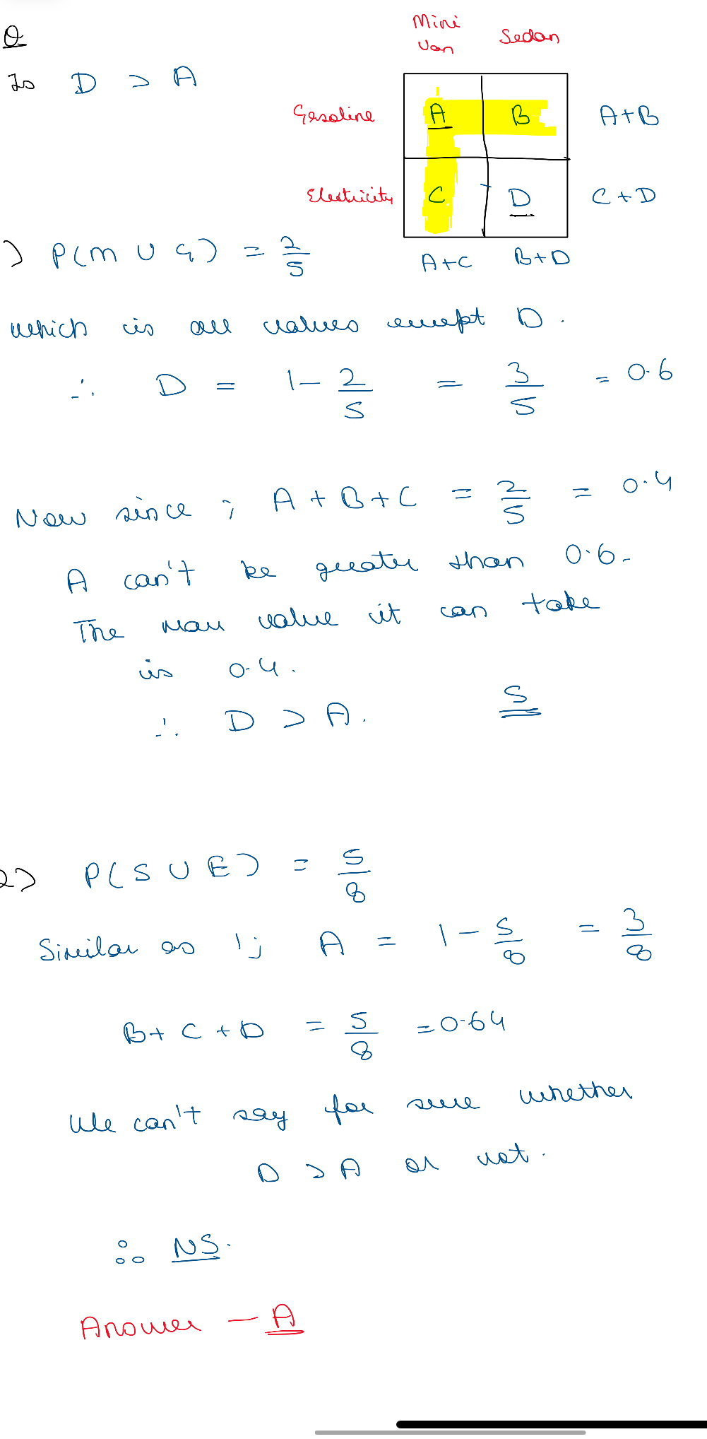 A rental firm has only two distinct types of vehicles: minivans and sedans. Each vehicle runs on exactly one fuel type, either gasoline or electricity. If a vehicle is selected at random, is the probability that it is a sedan running on electricity greater than the probability that it is a minivan running on gasoline?