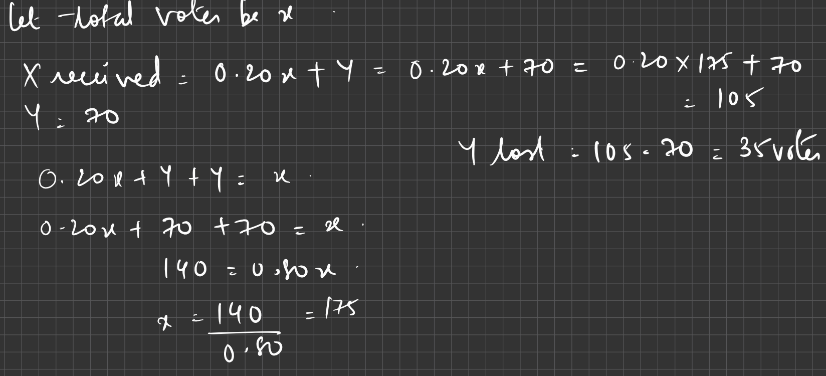 now question asked us to find how many votes did second proposal lost, which means X-Y, but it is nothing but 20% of Total vote. So, our answer is Y/2 = 35
