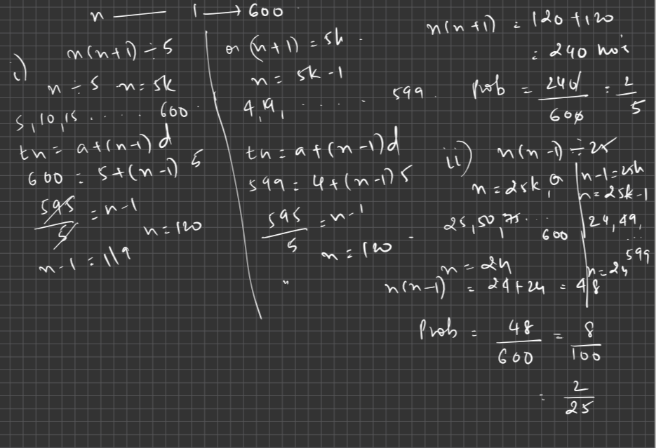 For q, we want n(n−1) to be divisible by 25. Again, n and n−1 are consecutive, so only one of them can be divisible by 25. So we look for values where either n is a multiple of 25 (like 25, 50, 75...) or n−1 is a multiple of 25 (which means n=26,51,76...n). Each of those patterns also happens once every 25 numbers, so 2 out of every 25 values work.