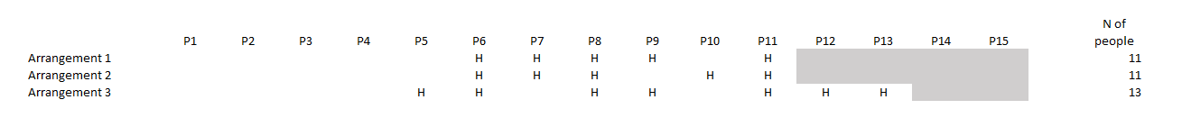 H - H - H - X - X - X - X - X - X - H | H - H - H - HHowever, we can also have 15 people if we swap X and H in the last positions (remember, from (2) we know that one hat must be in position 9 or 10):