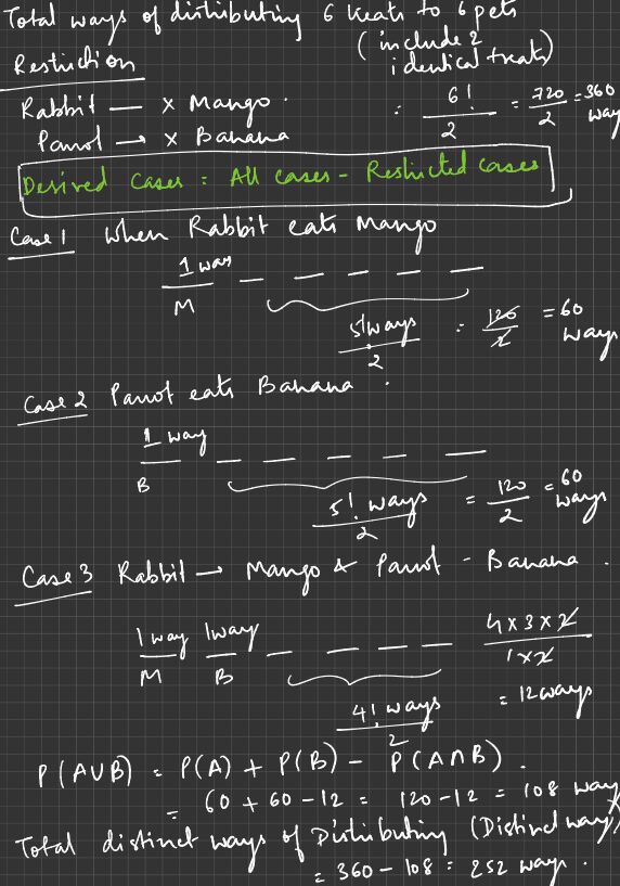Anna has six pets and plans to give each one a treat. The treats consist of two identical apple slices, along with one banana, one carrot, one mango, and one pear. Her rabbit refuses to eat the mango, and her parrot refuses to eat the banana. In how many distinct ways can she distribute the treats among the pets?