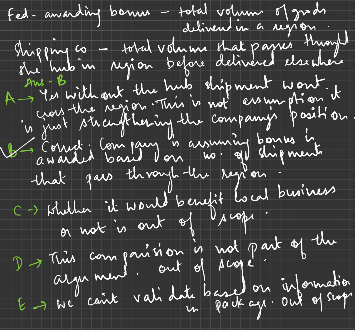 This breaks the argument. If the award is only for what is delivered to businesses inside the region, then the shipment passing through the hub does not qualify for bonuses at all, so an increase in its volume does not affect the bonuses.